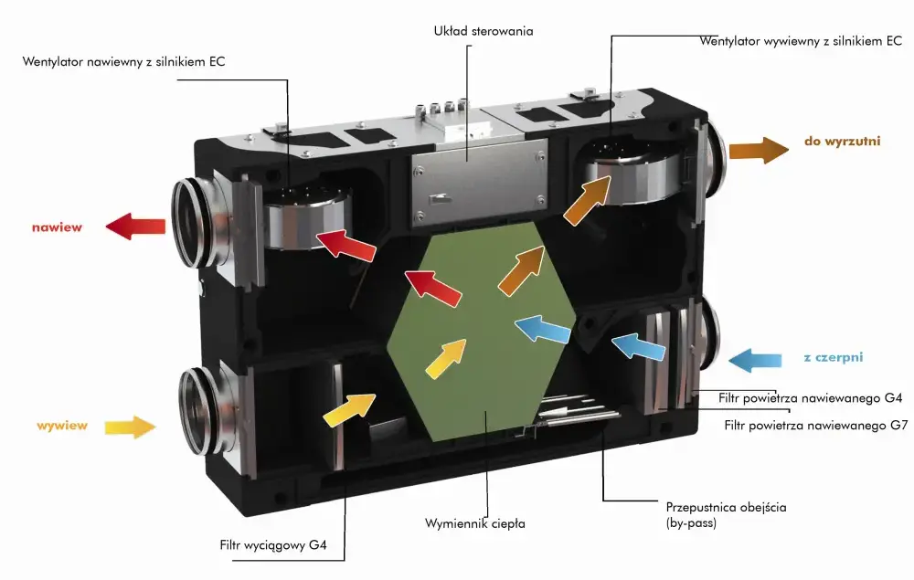 Centrala pobiera powietrze z zewnątrz, oczyszcza je, ogrzewa energią odzyskaną z powietrza usuwanego, a następnie rozprowadza kanałami po całym budynku. Zużyte powietrze jest jednocześnie usuwane na zewnątrz.