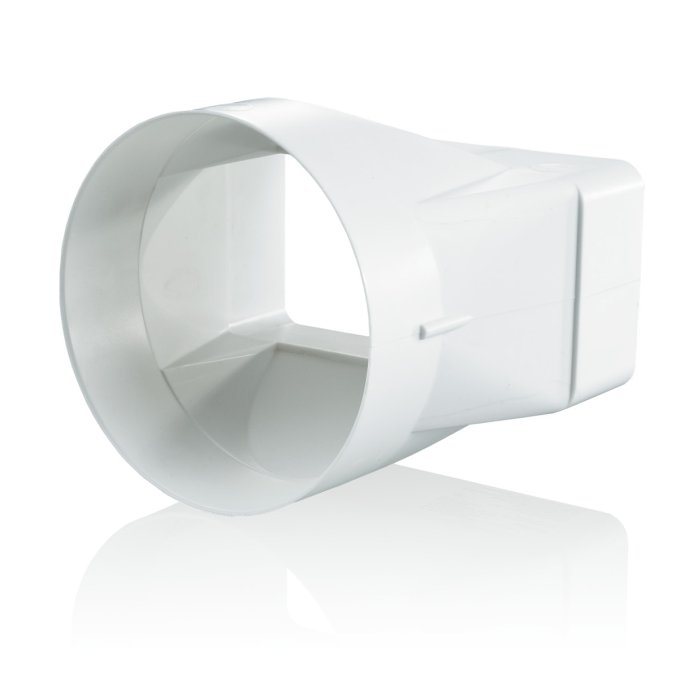 Łącznik przekrojów zmiennych - współosiowy. Pozwala na połączenie współosiowe kanału płaskiego z okrągłym. Łatwy montaż bez specjalistycznych narzędzi„na wcisk”, nie wymaga spoiwa np. w postaci kleju, lekka konstrukcja, estetyczny wygląd.
