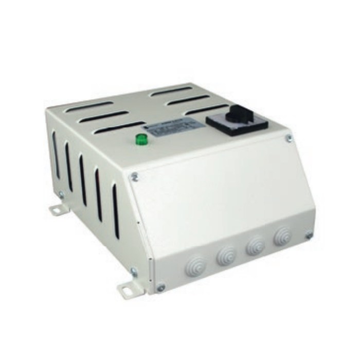 Transformatorowe, przemysłowe regulatory A3RW do regulacji prędkości obrotowej trójfazowych silników wentylatorowych sterowanych napięciowo. Montowane w profesjonalnych instalacjach wentylacyjnych lub grzewczych. Do pięciostopniowego nastawu prędkości obrotowej służy pokrętło umieszczone na panelu metalowej obudowy. Wyposażone w niezależny włącznik oraz lampkę sygnalizującą alarm. Obwód sterowania regulatora chroniony bezpiecznikiem. Wbudowane zabezpieczenie preciwzamrożeniowe (styki FS) oraz zabezpieczenie termiczne silnika (styki TK). Wykonanie w II klasie izolacji Stopnień ochrony IP21. Max temperatura otoczenia 25°C. Klasa cieplna izolacji B(130°C). Wykonanie zgodnie z EN 61558-2-13.